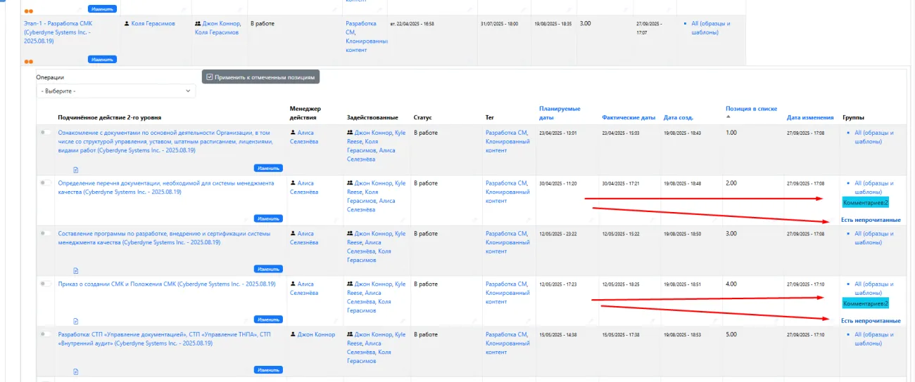 • В таблице действий счетчик  комментариев автоматически отображает их количество и все комментарии, которые пользователь еще не прочитал.  Функция особенно будет полезна  администраторам и участникам проектов для отслеживания обсуждений и оперативного обмена информацией по каждому из них.