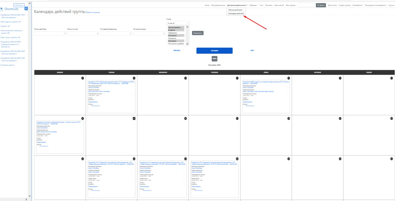 • ERP.Znaem.by представляет новый апгрейд: добавлены три вида календарей для полной визуализации деятельности! Теперь управляйте задачами с календарем всех доступных действий (через главное меню), календарем группы (на странице группы) и календарем контакта (на странице контакта) — всё в удобном формате для быстрого контроля и планирования.​ Оптимизируйте бизнес-процессы уже сегодня на ERP.Znaem.by — платформе, созданной для устойчивости в условиях конкуренции и санкций! Ключевые преимущества: -Полный обзор: Все действия, задачи и события в одном интерфейсе — никаких пропущенных дедлайнов. -Гибкость для команд: Групповые и персональные календари ускоряют координацию в защищённой ИТ-инфраструктуре. -Интуитивный доступ: Клик по кнопке — и календарь готов, с поддержкой иерархии групп и ролей.​ Оптимизируйте бизнес-процессы уже сегодня на ERP.Znaem.by — платформе, созданной для устойчивости в условиях конкуренции и санкций!